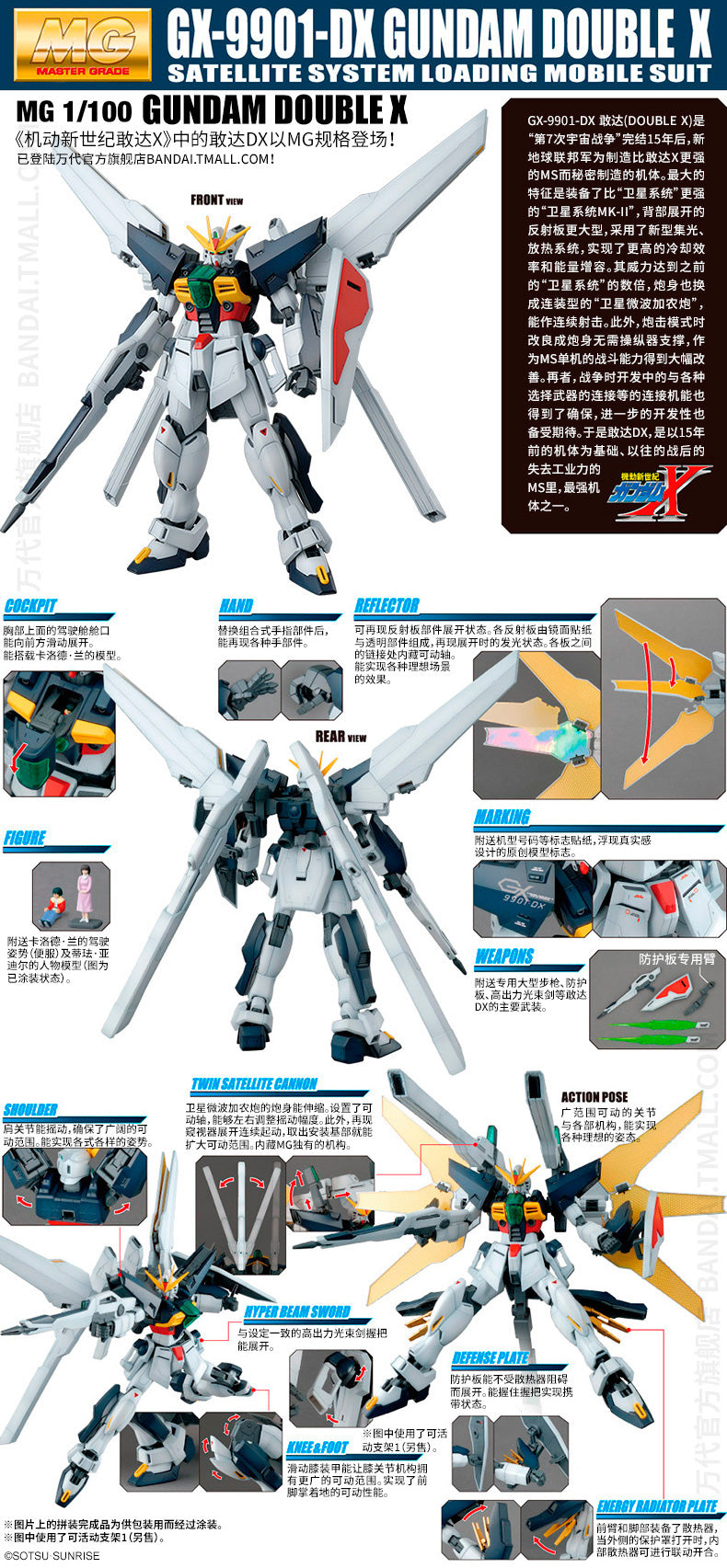 Fra  "After War Gundam X" Er det den mægtige Gundam Double X! Den har de samme indre delesom Double X. De store Twin Satellite Cannons kan folde ud med de store reflector paneler spredt. Kanonerne kan vinkles i den retning du ønsker og kan desuden låses fast på skuldrene for bedre stabilitet. Der er desuden reflector paneler på både underarme og underben. Den kommer med Shiled, Buster Rifle, 2 Twin Satellite Cannons, 2 Hyper Beam Swords og en in-scale figur af Garrod Ran og Tiffa Adill.